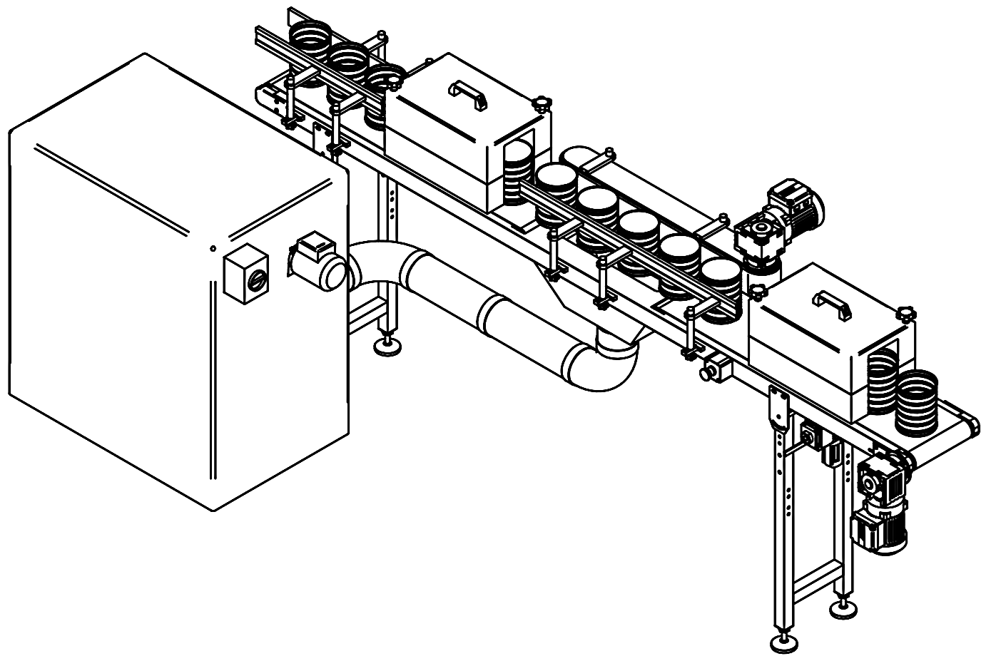 Containers enter into twister tunnel, then they are turned from open side up to open side down, and possible dust and dirty particles fall down. Dust Aspiration System collects all dust into Dust Hopper. Two ionising nozzles blow air inside containers, assuring that all dirty is removed from packaging corners and is not stuck to the walls. After this operation, the containers are turned again from open side down to open side up and moved forward to the next production stages by handling conveyor.