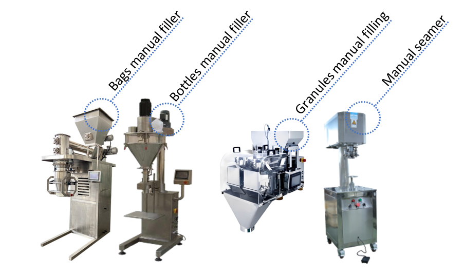 Dosage, pesage, remplissage, sertissage, bouchage, fermeture.