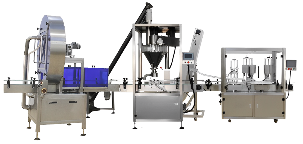 Linha de envase de pó para latas. Linha de produção de fórmulas infantis.