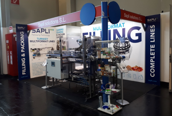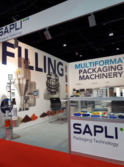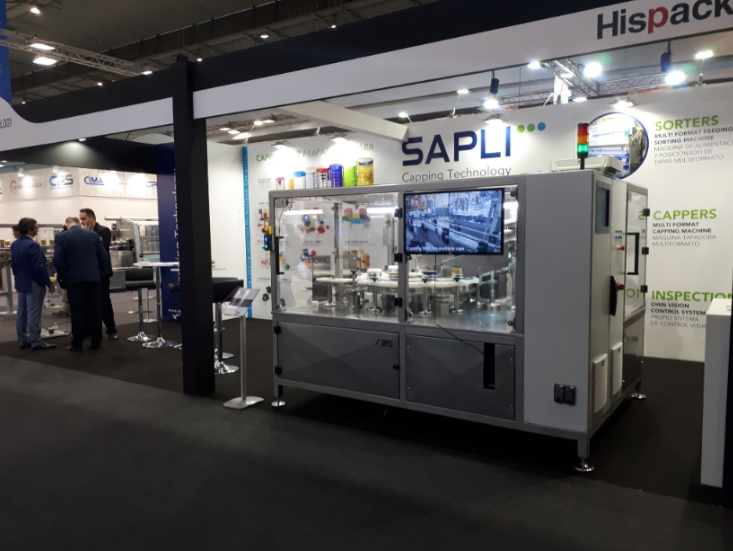 After cleaning and UV sterilization, cans are placed on the conveyor, with passes through a centrifugal scoop feeder that places a scoop into each can. The scoops are dropped into a hopper, from which an inclined water-fall type feeder lifts them up to the sorter, where they are oriented. The scoops are handled through discharge tunnel, which maintains the orientation and then they are dropped into each can. A sensor at the entrance of the scoop feeder detects the presence or absence of cans and turns the feeder on or off accordantly.